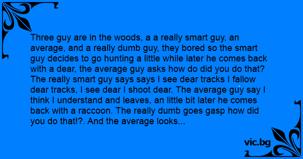 Three guy are in the woods, a a really smart guy, an average, and a really dumb guy, they bored so the smart guy decides to go hunting a little while later he comes back with a dear, the average guy asks how do did you do that? The really smart guy says says I see dear tracks I fallow dear tracks, I see dear I shoot dear. The average guy say I think I understand and leaves, an little bit later he comes back with a raccoon. The really dumb goes gasp how did you do that!?. And the average looks at him funny and says well I see raccoon tracks I fallow raccoon tracks, I see raccoon I shoot raccoon. The super dumb guy thinks for a second and says Oooohh, ok I thiNo I can do that… and leaves. Hours pass and and the guy finally returns, hurt, вlооdy, and horribly mingled. They run to help him. Finally one of the guys ask him what happened this is what he said: I see train tracks, I fallow train tracks. I see train I shoot train. But train keep coming.