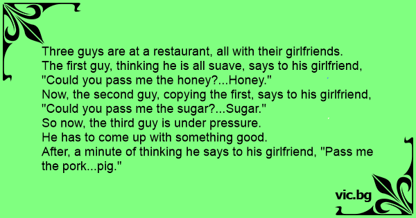 After, a minute of thinking he says to his girlfriend, "Pass me the pork...pig."