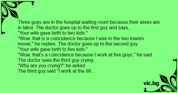 Three guys are in the hospital waiting room because their wives are in labor. The doctor goes up to the first guy and says,