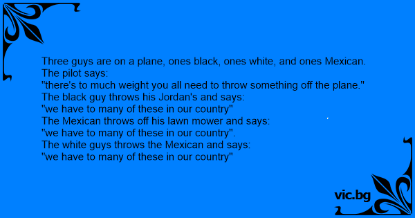 Бай Ганьо, американеца и турчина се качват на самолет, но самолетът аварирал. Пилотът казва: