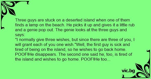 "I normally give three wishes, but since there are three of you, I will grant each of you one wish."Well, the first guy is sick and tired of being on the island, so he wishes to go back home. РООF!He disappears. The second one said he, too, is tired of the island and wishes to go home. РООF!He too disappears. The genie then turns to the last guy and asks him what his wish is."Gee," he says," I'm awfully lonely here by myself. I wish my friends were still here!"
