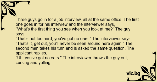 "Uh, you've got no ears." The interviewer throws the guy out, cursing and yelling that he'll never get a job with his company. As he is leaving, the second guy warns the third guy, "Listen man, whatever you do, don't say he hasn't got any ears. He's so touchy with the ear thing."