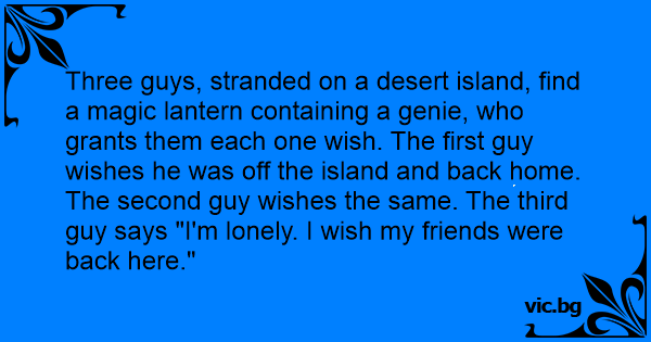 Three guys, stranded on a desert island, find a magic lantern containing a genie, who grants them each one wish. The first guy wishes he was off the island and back home. The second guy wishes the same. The third guy says "I'm lonely. I wish my friends were back here."