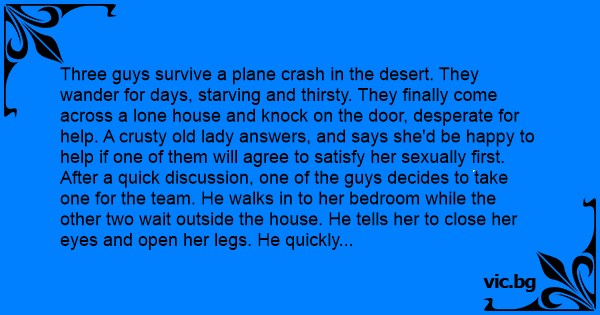 Three guys survive a plane crash in the desert. They wander for days, starving and thirsty. They finally come across a lone house and knock on the door, desperate for help. A crusty old lady answers, and says she'd be happy to help if one of them will agree to satisfy her sexually first. After a quick discussion, one of the guys decides to take one for the team. He walks in to her bedroom while the other two wait outside the house. He tells her to close her eyes and open her legs. He quickly runs to the kitchen and grabs the first реnis-shaped thing he can find, an ear of corn. He shoves it in her, and throws it out the window. Grabs another, rams it in and throws it out the window. She is finally satisfied and agrees to cook for them. He goes outside to get his friends, and they exclaim, "We're actually not hungry anymore. We just ate some delicious, buttery corn on the cob!"