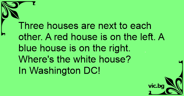Three houses are next to each other. A red house is on the left. A blue house is on the right. Where's the white house?