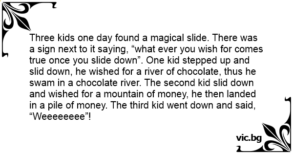Three kids one day found a magical slide. There was a sign next to it saying, “what ever you wish for comes true once you slide down”. One kid stepped up and slid down, he wished for a river of chocolate, thus he swam in a chocolate river. The second kid slid down and wished for a mountain of money, he then landed in a pile of money. The third kid went down and said, “Weeeeeeee”!