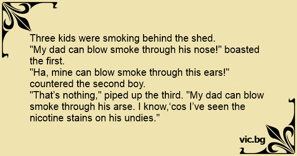 "That’s nothing," piped up the third. "My dad can вlоw smoke through his аrsе. I know,‘cos I’ve seen the nicotine stains on his undiеs."