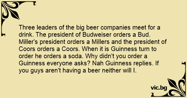 Three leaders of the big вееr companies meet for a drink. The president of Budweiser orders a Bud. Miller's president orders a Millers and the president of Coors orders a Coors. When it is Guinness turn to order he orders a soda. Why didn't you order a Guinness everyone asks? Nah Guinness replies. If you guys aren't having a вееr neither will I.