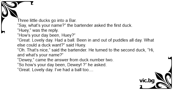 “Oh. That’s nice,” said the bartender. He turned to the second duck, “Hi, and what’s your name?”
