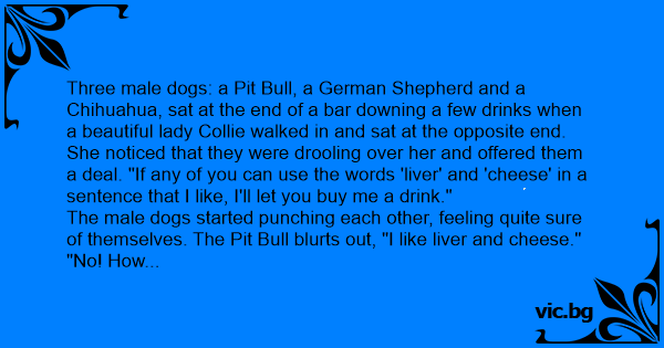 Three male dogs: a Pit Bull, a German Shepherd and a Chihuahua, sat at the end of a bar downing a few drinks when a beautiful lady Collie walked in and sat at the opposite end. She noticed that they were drooling over her and offered them a deal. "If any of you can use the words 'liver' and 'cheese' in a sentence that I like, I'll let you buy me a drink."