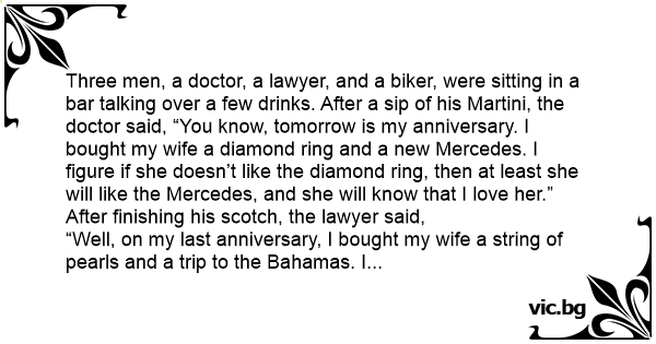 Three men, a doctor, a lawyer, and a biker, were sitting in a bar talking over a few drinks. After a sip of his Martini, the doctor said, “You know, tomorrow is my anniversary. I bought my wife a diamond ring and a new Mercedes. I figure if she doesn’t like the diamond ring, then at least she will like the Mercedes, and she will know that I love her.”
