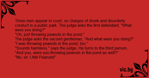 "Sounds harmless," says the judge. He turns to the third person, "And you, were you throwing peanuts in the pond as well?"