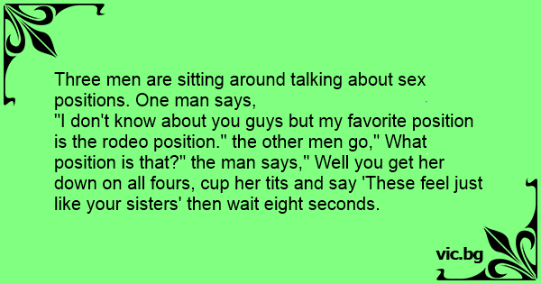 "I don't know about you guys but my favorite position is the rodeo position." the other men go," What position is that?" the man says," Well you get her down on all fours, cup her тiтs and say 'These feel just like your sisters' then wait eight seconds.