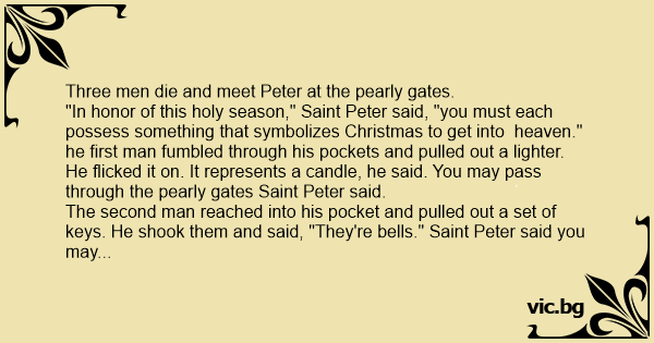 Three men wait at the gates of heaven on Christmas Eve. They're told they have to present a Christmas gift to get in. The first man checks his pockets and finds pine needles from his family's tree....