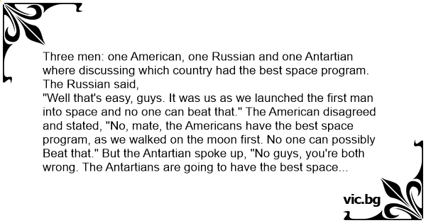 Beat that." But the Antartian spoke up, "No guys, you're both wrong. The Antartians are going to have the best space program as we are going to put the first man on the sun!" Both the American and Russian where in fits of laughter after hearing this and asked how this was possible without burning up? The Antartian simply replied, "Well, we have this fool proof plan; we're going during the night!"