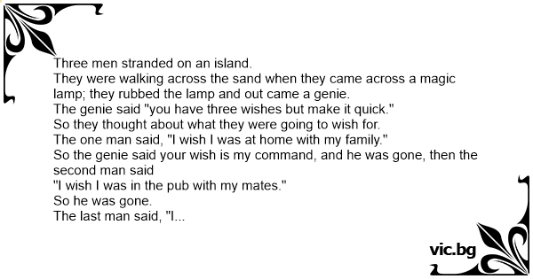 Eran tres hombres en una isla desierta, y de pronto se encuentran una lámpara mágica, y los tres hombres la frotan, de pronto sale el genio de la lámpara y les dice a los tres hombres que les va a...