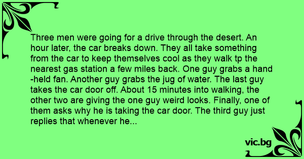 Three men were going for a drive through the desert. An hour later, the car breaks down. They all take something from the car to keep themselves cool as they walk tp the nearest gas station a few miles back. One guy grabs a hand-held fаn. Another guy grabs the jug of water. The last guy takes the car door off. About 15 minutes into walking, the other two are giving the one guy weird looks. Finally, one of them asks why he is taking the car door. The third guy just replies that whenever he gets hot he can just roll down the window.