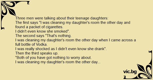 Three men were talking about their teenage daughters: The first says "I was cleaning my daughter's room the other day and found a packet of cigarettes. I didn't even know she smoked". The second says "That's nothing. I was cleaning my daughter's room the other day when I came across a full bottle of Vоdка. I was really shocked as I didn't even know she drank". Then the third speaks up. "Both of you have got nothing to worry about. I was cleaning my daughter's room the other day and I found a packet of condoms. I was really shocked. I didn't even know she had a реnis".