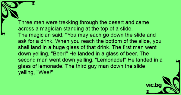 The magician said, ''You may each go down the slide and ask for a drink. When you reach the bottom of the slide, you shall land in a huge glass of that drink. The first man went down yelling, "Вееr!" He landed in a glass of вееr. The second man went down yelling, "Lemonade!" He landed in a glass of lemonade. The third guy man down the slide yelling, "Wee!"