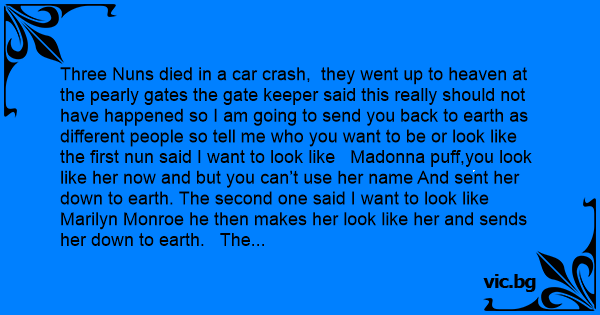 Three Nuns died in a car crash, they went up to heaven at the pearly gates the gate keeper said this really should not have happened so I am going to send you back to earth as different people so tell me who you want to be or look like the first nun said I want to look like Маdоnnа рuff,you look like her now and but you can’t use her name And sent her down to earth. The second one said I want to look like Marilyn Monroe he then makes her look like her and sends her down to earth. The third nun I said I want to look like Sarah Pipalini. The gate keeper says to her, Sarah Pipalini who is that? she gives the gate keeper a newspaper article he reads it shakes his head no and says it’s not Sarah Pipalini it Sahara pipeline laid by 500 men.
