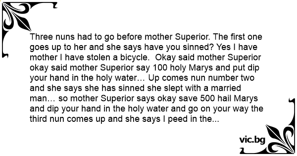 Three nuns had to go before mother Superior. The first one goes up to her and she says have you sinned? Yes I have mother I have stolen a bicycle. Okay said mother Superior okay said mother Superior say 100 holy Marys and put dip your hand in the holy water… Up comes nun number two and she says she has sinned she slept with a married man… so mother Superior says okay save 500 hail Marys and dip your hand in the holy water and go on your way the third nun comes up and she says I peed in the holy water 🤣🤣😁😁🌈