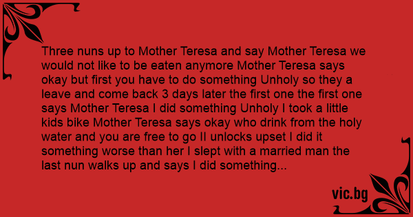 Three nuns up to Mother Teresa and say Mother Teresa we would not like to be eaten anymore Mother Teresa says okay but first you have to do something Unholy so they a leave and come back 3 days later the first one the first one says Mother Teresa I did something Unholy I took a little kids bike Mother Teresa says okay who drink from the holy water and you are free to go II unlocks upset I did it something worse than her I slept with a married man the last nun walks up and says I did something worse than all of them Mother Teresa says oh god oh gosh are there in the third nut and says I peed in the holy water