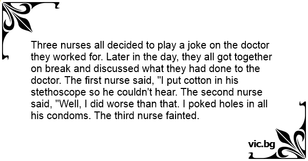 Three nurses all decided to play a joke on the doctor they worked for. Later in the day, they all got together on break and discussed what they had done to the doctor. The first nurse said, "I put cotton in his stethoscope so he couldn't hear. The second nurse said, "Well, I did worse than that. I poked holes in all his condoms. The third nurse fainted.