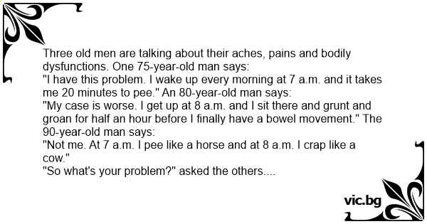 3 bejaarde mannen zitten samen koffie te drinken. Zegt de eerste: "ik heb een probleem, ik sta 's morgens op om 7uur, en het duurt zeker 3uur voor ik kan pissen" "Bwa" zegt de tweede, "ik sta ook...