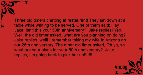 Three old timers chatting at restaurant! They sat down at a table while waiting to be served. One of them said; Hay Jake! Isn’t this your 50th anniversary? Jake replies! Yep. Well, the old timer asked, what are you planning on doing? Jake replies, well! I remember taking my wife to Arizona on our 25th anniversary. The other old timer asked, Oh ya, so what are your plans for your 50th anniversary? Jake replies, I’m going back to pick her up!!!!!!!