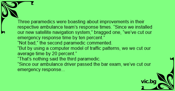 Three paramedics were boasting about improvements in their respective ambulance team’s response times. “Since we installed our new satellite navigation system,” bragged one, “we’ve cut our emergency response time by ten percent.”