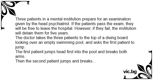 The doctor takes the three patients to the top of a diving board looking over an empty swimming pool, and asks the first patient to jump.