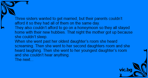 They also couldn’t afford to go on a honeymoon so they all stayed home with their new hubbies. That night the mother got up because she couldn’t sleep.