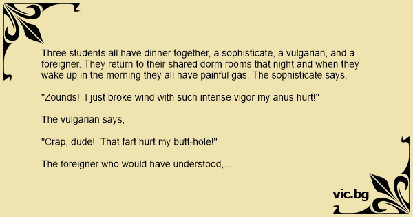 Three students all have dinner together, a sophisticate, a vulgarian, and a foreigner. They return to their shared dorm rooms that night and when they wake up in the morning they all have painful gas. The sophisticate says,