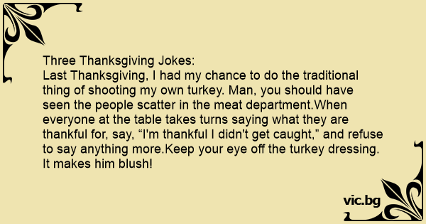 Last Thanksgiving, I had my chance to do the traditional thing of shooting my own turkey. Man, you should have seen the people scatter in the meat department.When everyone at the table takes turns saying what they are thankful for, say, “I'm thankful I didn't get caught,” and refuse to say anything more.Keep your eye off the turkey dressing. It makes him blush!