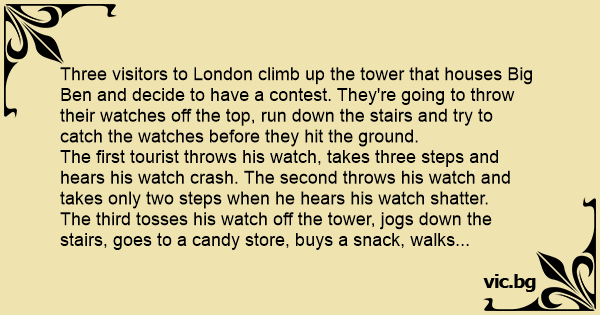 Three visitors to London climb up the tower that houses Big Ben and decide to have a contest. They're going to throw their watches off the top, run down the stairs and try to catch the watches before they hit the ground.