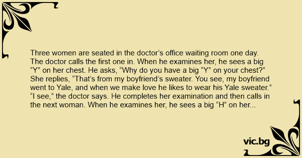 The doctor calls the first one in. When he examines her, he sees a big “Y” on her chest. He asks, “Why do you have a big “Y” on your chest?”