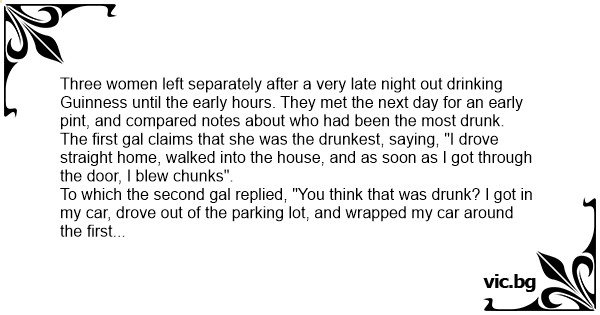 To which the second gal replied, "You think that was drunк? I got in my car, drove out of the parking lot, and wrapped my car around the first tree I saw. I don't even have insurance!"