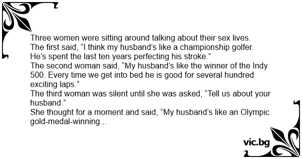 The second woman said, “My husband’s like the winner of the Indy 500. Every time we get into bed he is good for several hundred exciting laps.”
