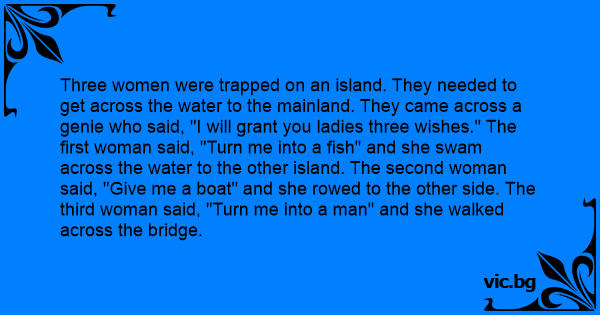 Three women were trapped on an island. They needed to get across the water to the mainland. They came across a genie who said, "I will grant you ladies three wishes." The first woman said, "Turn me into a fish" and she swam across the water to the other island. The second woman said, "Give me a boat" and she rowed to the other side. The third woman said, "Turn me into a man" and she walked across the bridge.