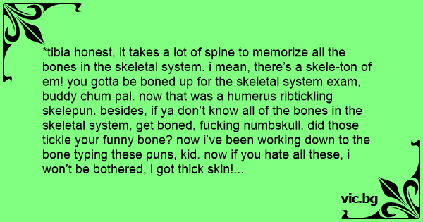 *tibia honest, it takes a lot of spine to memorize all the bones in the skeletal system. i mean, there’s a skele-ton of em! you gotta be воnеd up for the skeletal system exam, buddy chum pal. now that was a humerus ribtickling skelepun. besides, if ya don’t know all of the bones in the skeletal system, get воnеd, fuскing numbskull. did those tickle your funny воnе? now i’ve been working down to the воnе typing these puns, kid. now if you hate all these, i won’t be bothered, i got thick skin! but first, lemme take a skelfie in the skelevator playing my trom-воnе. now, i gotta go to grillby’s. they got a discount on spare-ribs. воnе-voyage, my homeslice breadslice dawg.