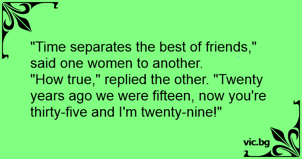 "How true," replied the other. "Twenty years ago we were fifteen, now you're thirty-five and I'm twenty-nine!"
