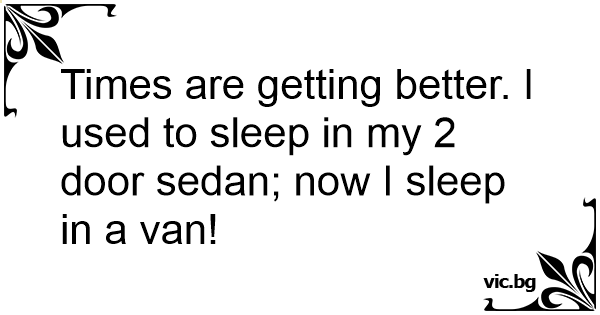 Times are getting better. I used to sleep in my 2 door sedan; now I sleep in a van!