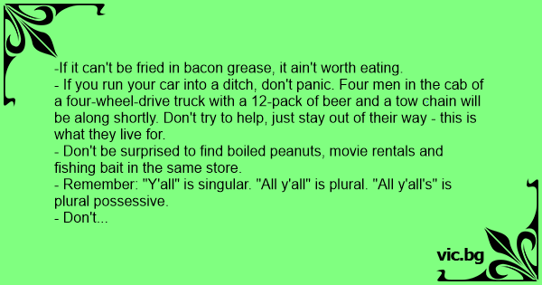 - If you hear a Southerner exclaim, "Hey, y'all, watch this!" - stay out of his way. These are likely the last words he will ever say.