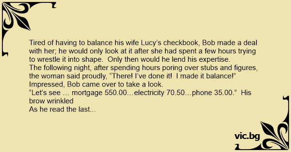 Tired of having to balance his wife Lucy’s checkbook, Bob made a deal with her; he would only look at it after she had spent a few hours trying to wrestle it into shape. Only then would he lend his expertise.