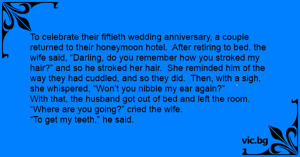 To celebrate their fiftieth wedding anniversary, a couple returned to their honeymoon hotel. After retiring to bed, the wife said, “Darling, do you remember how you stroked my hair?” and so he stroked her hair. She reminded him of the way they had cuddled, and so they did. Then, with a sigh, she whispered, “Won’t you nibble my ear again?”
