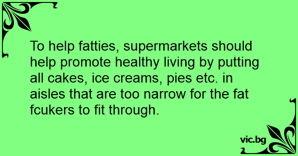 To help fatties, supermarkets should help promote healthy living by putting all cakes, ice creams, pies etc. in aisles that are too narrow for the fат fcukers to fit through.