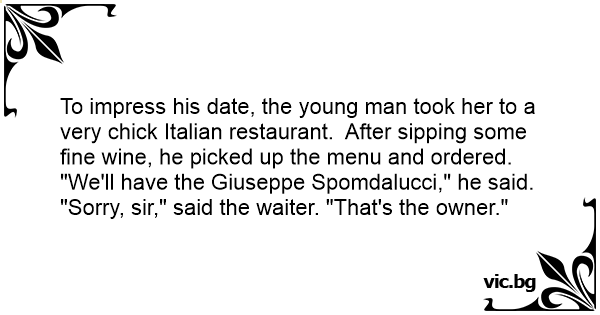 За да впечатли половинката си, младеж я завел в много шик италиански ресторант. След като пийнали хубаво вино, и се развеселили, той взел менюто и с италиански акцент поръчал на сервитьора: - Ще...