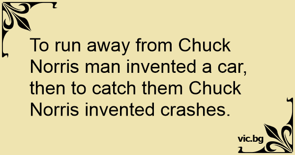To run away from Chuck Norris man invented a car, then to catch them Chuck Norris invented crashes. 21 0 0 Car and driving jokes Chuck Norris Jokes Men jokes