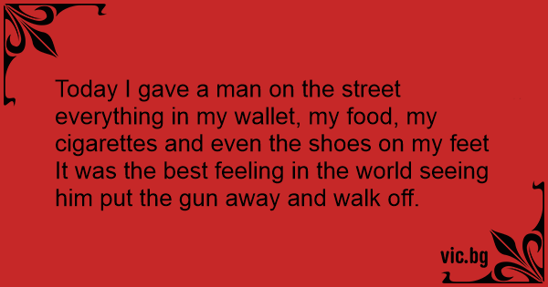 Today I gave a man on the street everything in my wallet, my food, my cigarettes and even the shoes on my feet