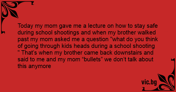 Today my mom gave me a lecture on how to stay safe during school shootings and when my brother walked past my mom asked me a question "what do you think of going through kids heads during a school shooting " That’s when my brother came back downstairs and said to me and my mom “bullets” we don’t talk about this anymore